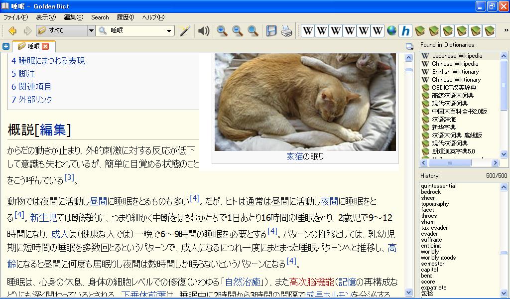機能: Wikipedia記事の閲覧、外部辞書ファイル(Stardict、Mdict(.mdx/.mdd)他多数対応)の検索が可能
